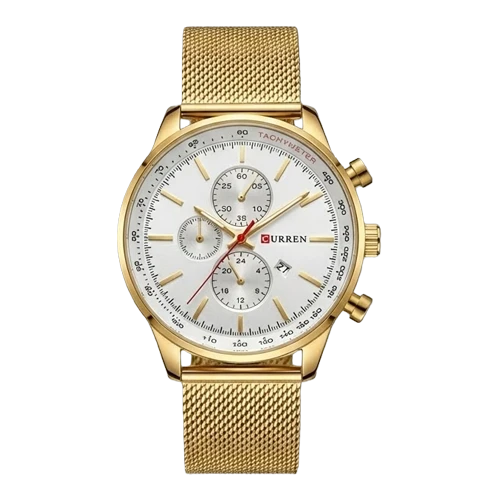 كورين ساعة رجالية – ذهبي / أبيض / سوار شبكي معدني (كرونوغراف)