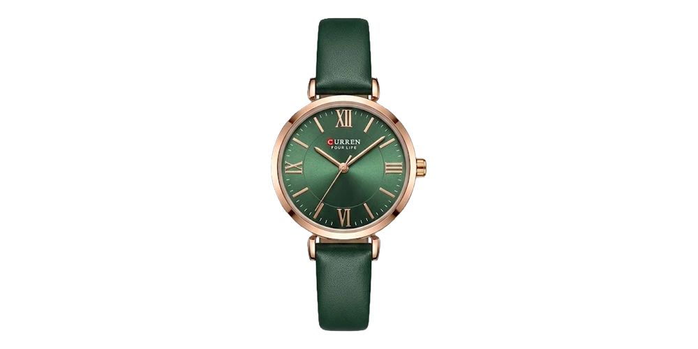 كورين ساعة نسائية – روز غولد / أخضر / سوار جلدي (أرقام رومانية)