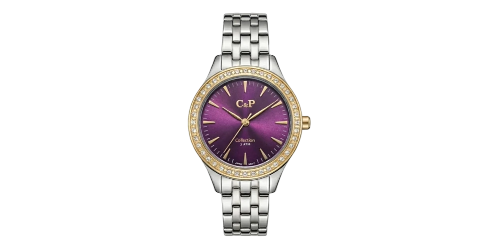جي : بي ساعة نسائية – ثنائي اللون ذهبي/فضي / بنفسجي / سوار معدني (إطار كريستال)