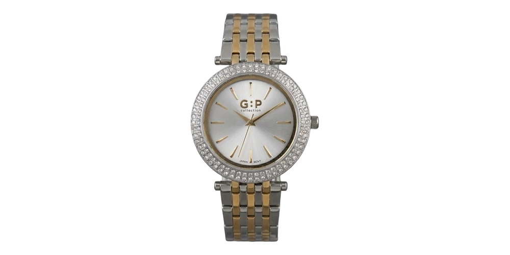 جي : بي ساعة نسائية – ثنائي اللون ذهبي/فضي / أبيض / سوار معدني (إطار كريستال)