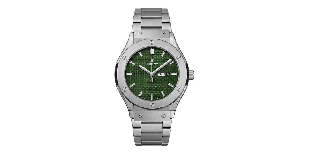 هوبلوت ساعة رجالية – فضي / أخضر / سوار معدني (نافذة تاريخ)