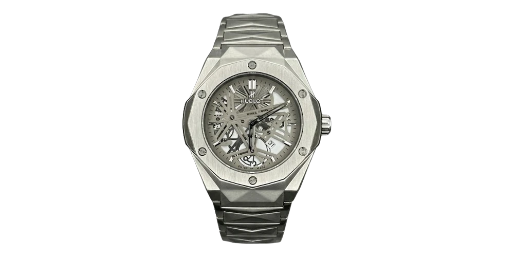 هوبلوت ساعة رجالية – فضي / رمادي هيكلي / سوار معدني (قرص هيكلي)