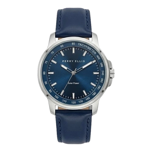 بيري إيليس ساعة رجالية – فضي / كحلي / سوار جلدي (قرص تاكيمتر)