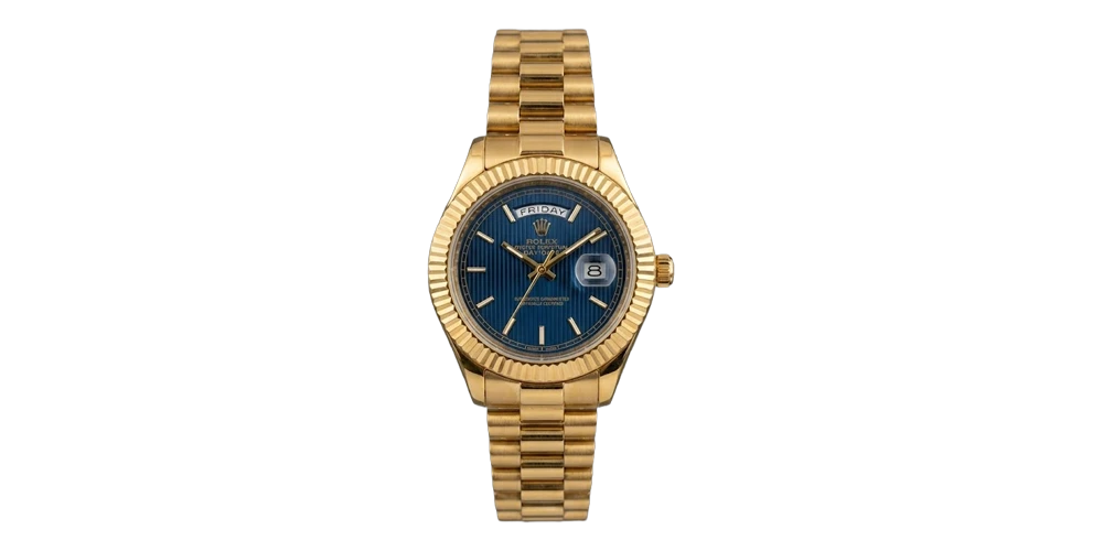 ساعة رولكس للرجال بسوار معدني ذهبي ومينا زرقاء منقوشة وإطار مسنن ذهبي