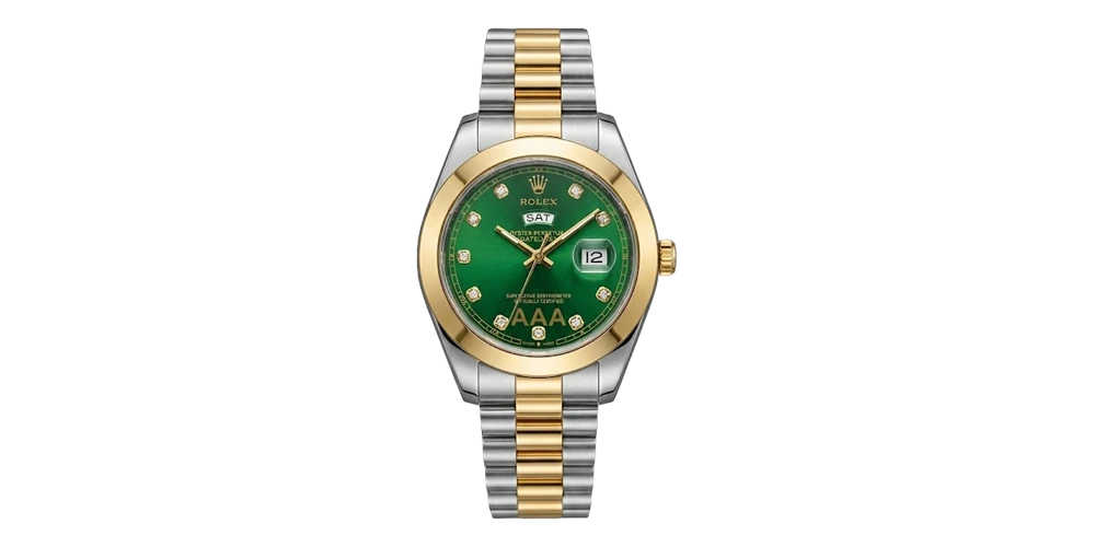 ساعة رولكس للرجال بسوار معدني ثنائي اللون ومينا خضراء وإطار أملس ذهبي
