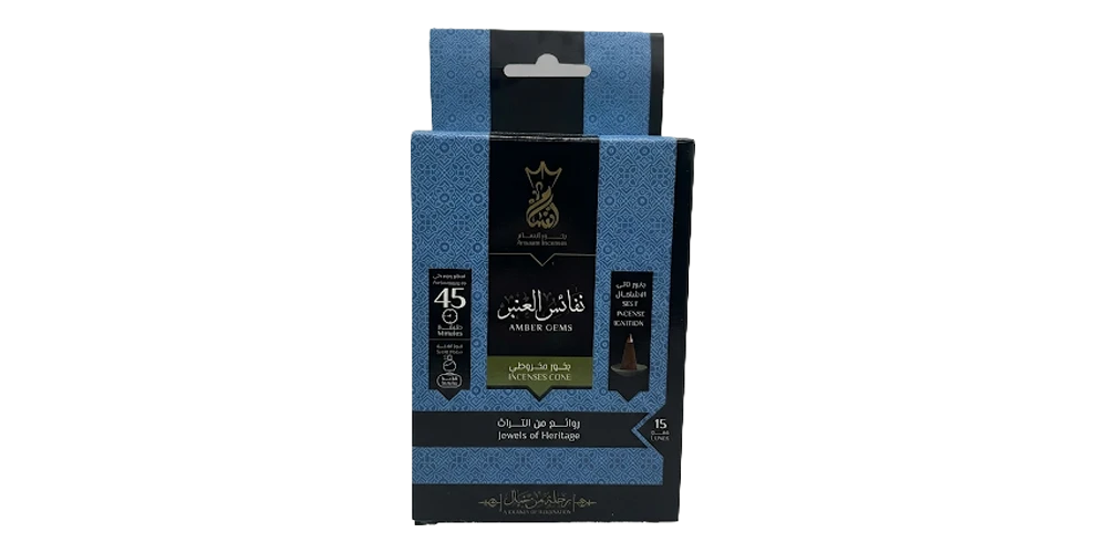 بخور مخروطي ذاتي الاشتعال نفائس العنبر من بخور أنسام ١٥ قمع ٤٥ دقيقة مع حامل مخصص