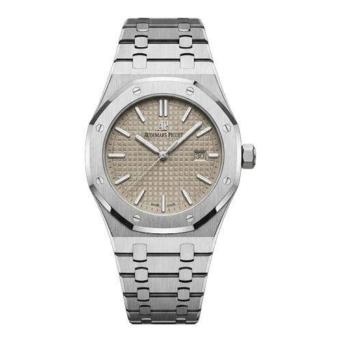 أوديمار بيغه ساعة رجالية – فضي / بيج بنقشة بارزة / سوار معدني (نافذة تاريخ)